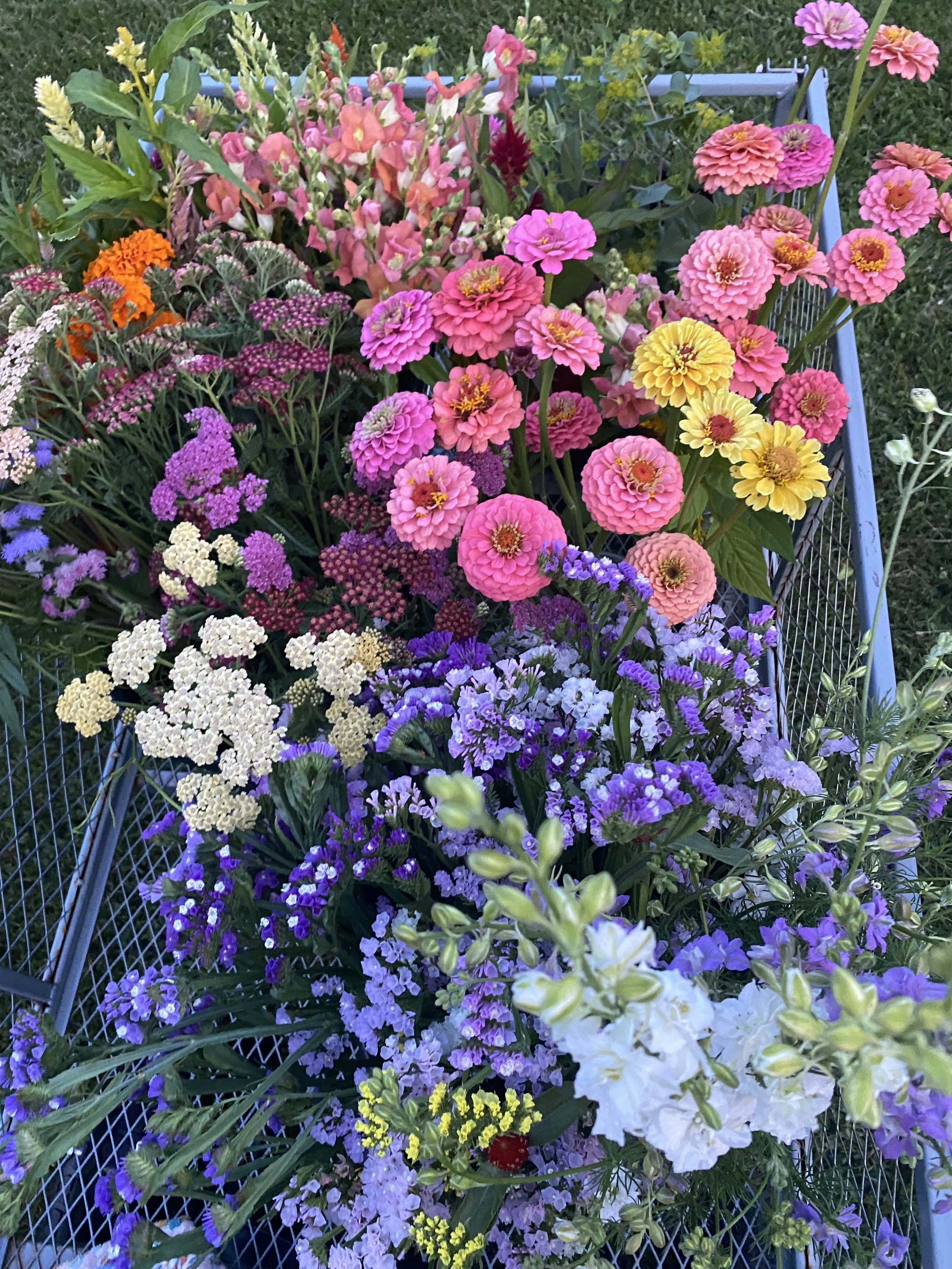 July-first frost (usually early October) dahlias, zinnias, cosmos, celosia, cress, lisianthus, craspedia, marigolds, ageratum, and snapdragons are in season.